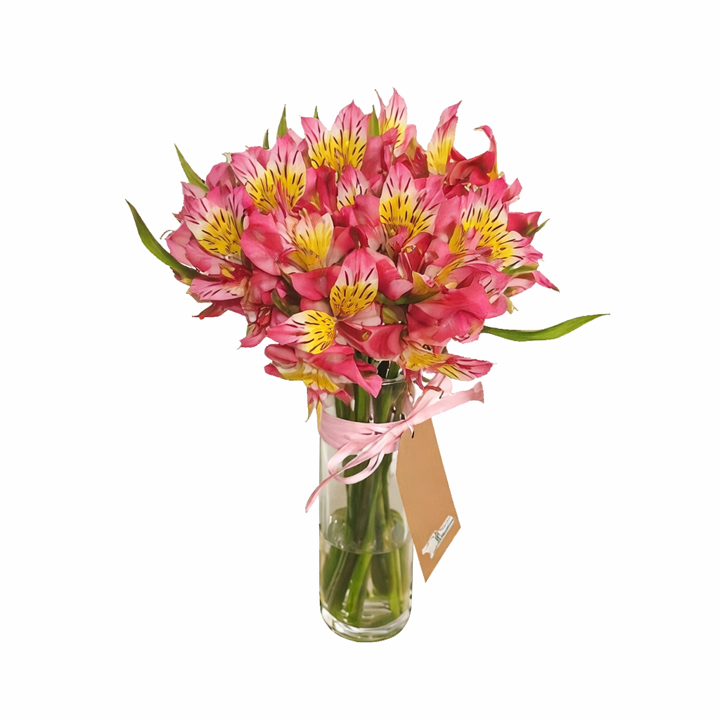 Um arranjo delicado e encantador de astromélias em tons de rosa com detalhes amarelos, acomodadas em vaso de vidro transparente com laço em cetim. Leve e cheio de charme, é perfeito para transmitir carinho, gratidão e alegria, ideal para presentear ou decorar com suavidade e elegância.