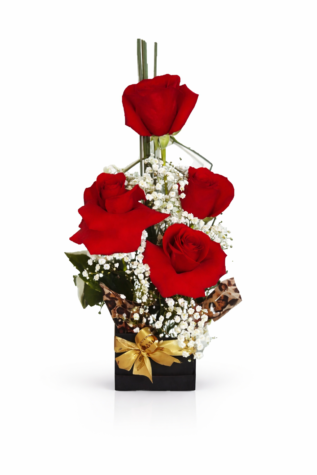 Elegante arranjo com rosas vermelhas e delicado mosquitinho branco, acomodados em base sofisticada com acabamento em laço. Uma opção clássica e romântica para presentear em momentos especiais.