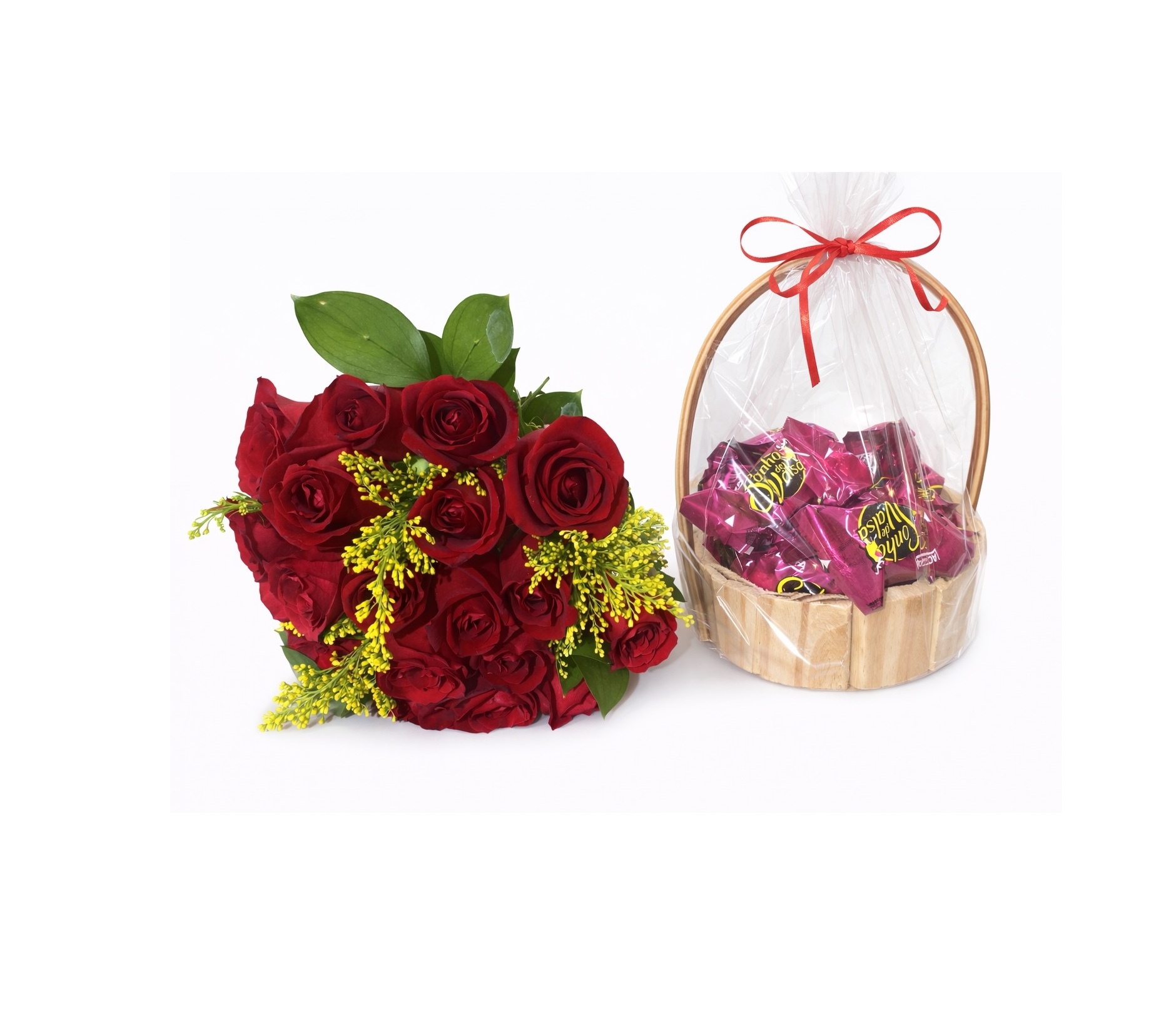 Combo romântico composto por um buquê de 20 rosas vermelhas naturais, acompanhado de folhagens e flores complementares, junto com uma charmosa cesta com chocolates. Uma opção clássica e apaixonante para surpreender em momentos especiais.