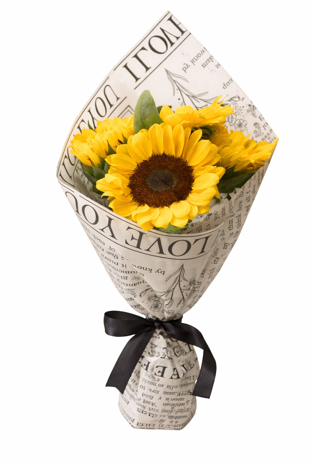 Buquê alegre e encantador composto por 04 girassóis frescos, cuidadosamente embalados em papel decorativo estilo jornal e finalizado com laço elegante. Uma opção perfeita para presentear e transmitir carinho, felicidade e boas energias em diversas ocasiões.