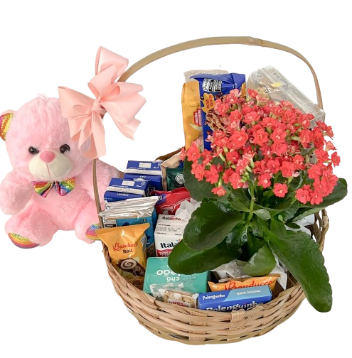 Produtos inclusos na cesta: 2 caixas pequenas de Suco de frutas 200 ml, 1 Caixa de Achocolatado 200 ml, 1 Pacote de Biscoito Waffer, 1 Sachê de Chá, 1 Cream Cheese, 1 Sachê de Capuccino, Sachês de Açúcar, 2 Bolinhos pequenos 40g, 2 Pacotinhos pequenos de ClubSocial 25g, 1 Pacote de Torrada Bauducco 160g, 1 Pacote de Café Solúvel, 4 Tabletes de Queijo Polenghi, 1 Pacote de M&M's, 1 pelúcia P e 1 Caixa de Ferrero Rocher.