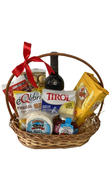 Produtos inclusos no arranjo: 01 vinho chileno, 01 torrada, 01 queijo mussarela, 01 ricota, 01 geléia, 01 biscoito, 01 salame fatiado e 01 Ferrero Rocher 150g.