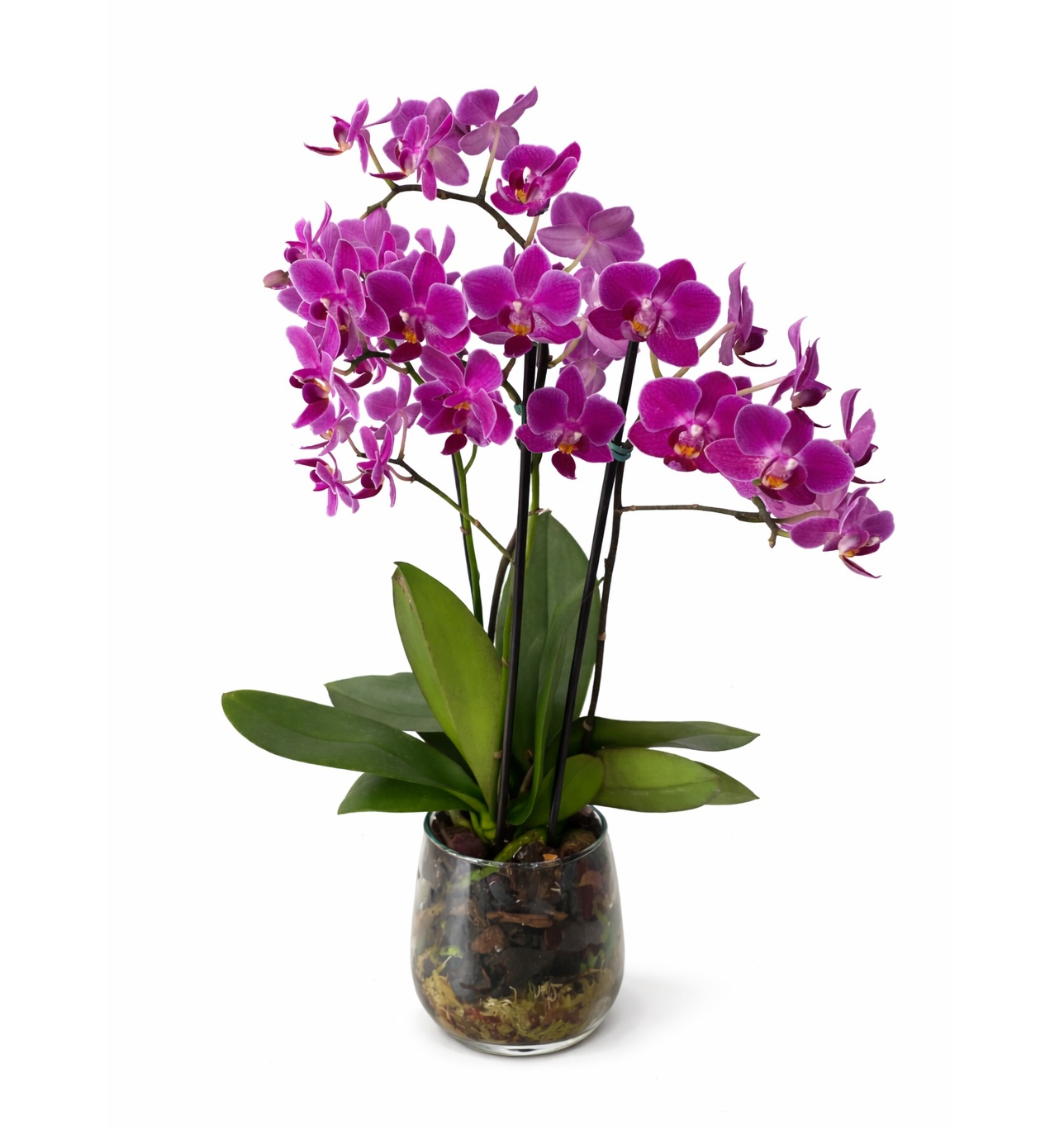 Orquídea Phalaenopsis em vaso de vidro, com flores delicadas e exuberantes que transmitem elegância e sofisticação. Ideal para presentear ou decorar ambientes, trazendo charme, leveza e um toque natural ao espaço.