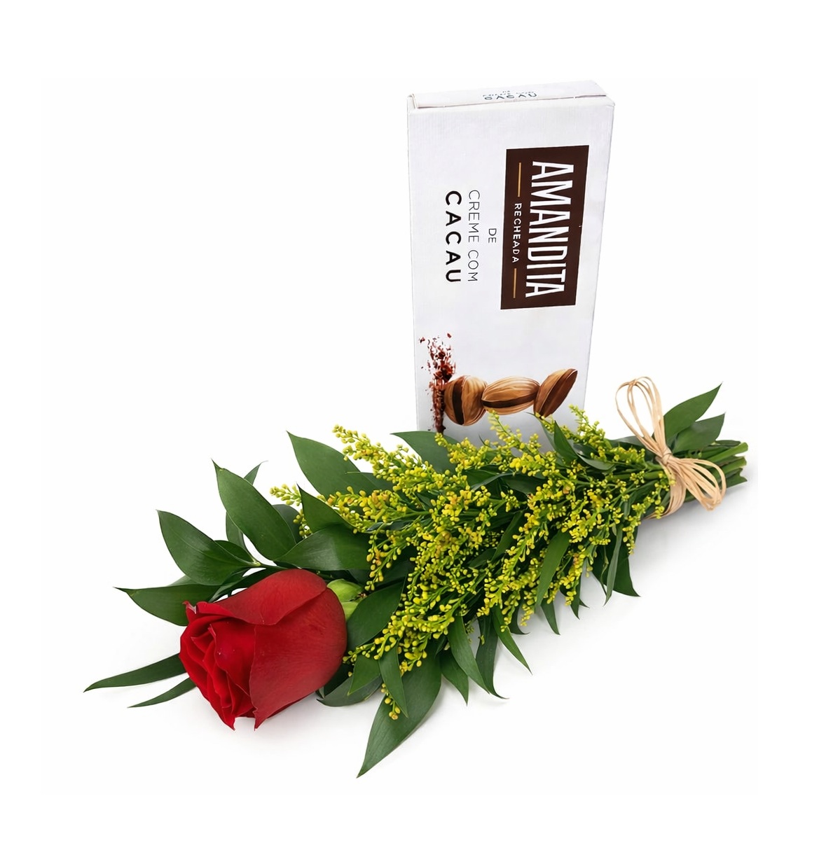 Delicado mimo composto por rosa vermelha natural acompanhada de folhagens e flores complementares, finalizado com chocolate Amandita. Uma opção charmosa e romântica para surpreender e demonstrar carinho em qualquer ocasião.